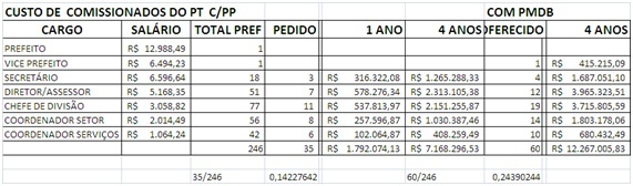 São Bento - A saída do PT da coligação com o PP pode significar uma grande economia aos cofres públicos, pois se pediram 35 cargos na administração, conforme comentários que circulam na cidade. Anexo demonstrativo da economia se estes cargos não forem ocupados por ninguém, que é o que estou propondo aos candidatos Magno Bollmann e Dr. Tomazini. Na planilha podemos ver o total de cargos existentes na prefeitura atualmente, e fiz uma distribuição proporcional por cargo. A economia em 4 anos chega a mais de 7 milhões de reais, valor este computando salários, 13º, 1/3 sobre férias e 20% de INSS.