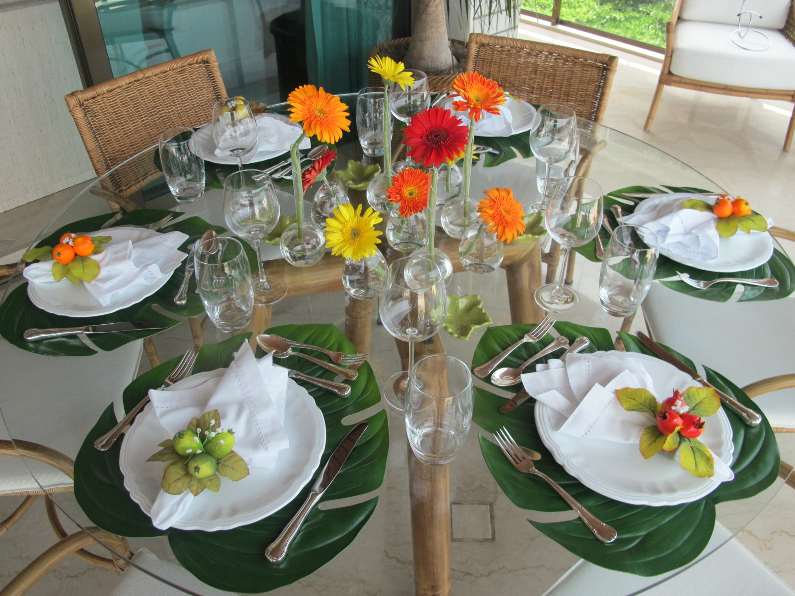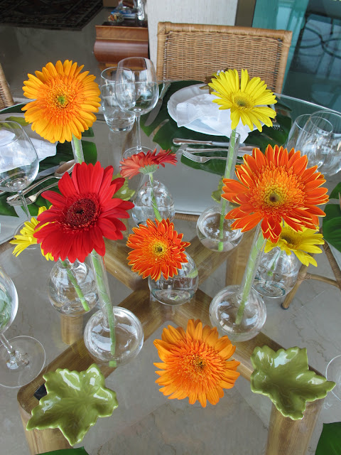 GÉRBERAS VERMELHAS, LARANJAS E AMARELAS EM VASINHOS SOLITÁRIOS DE VIDRO