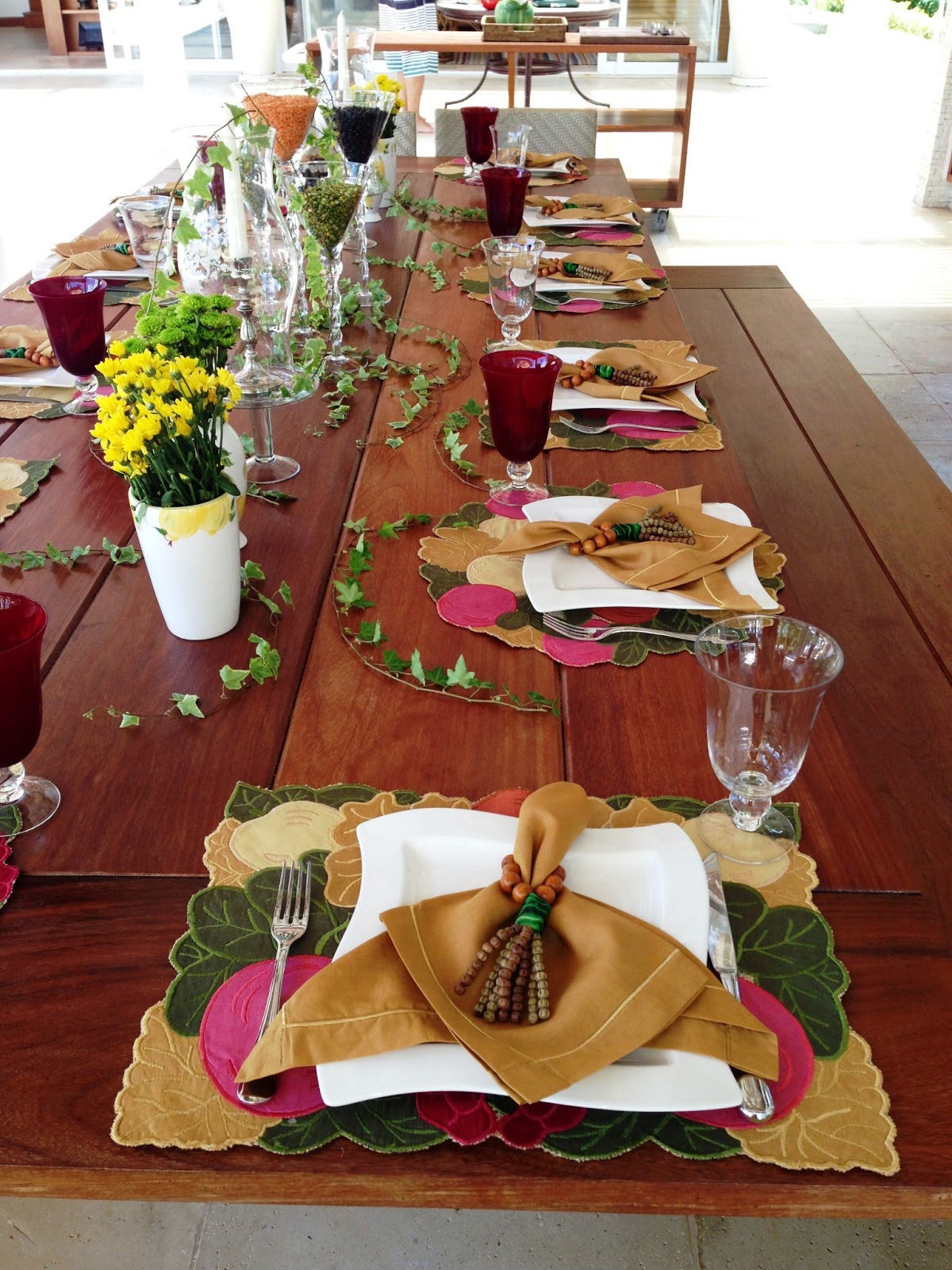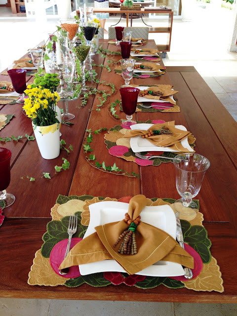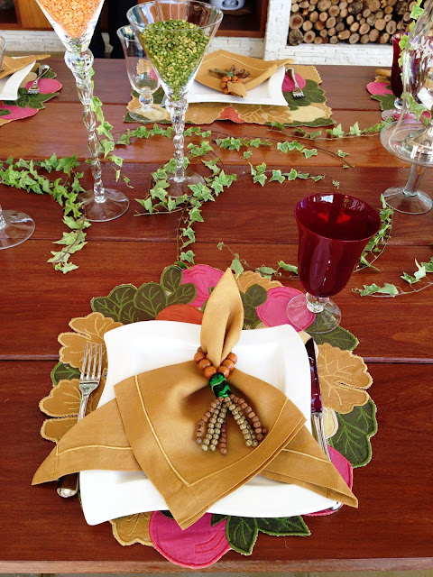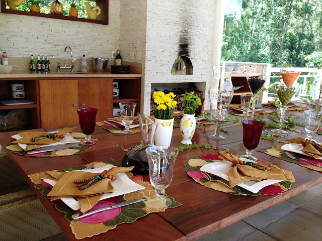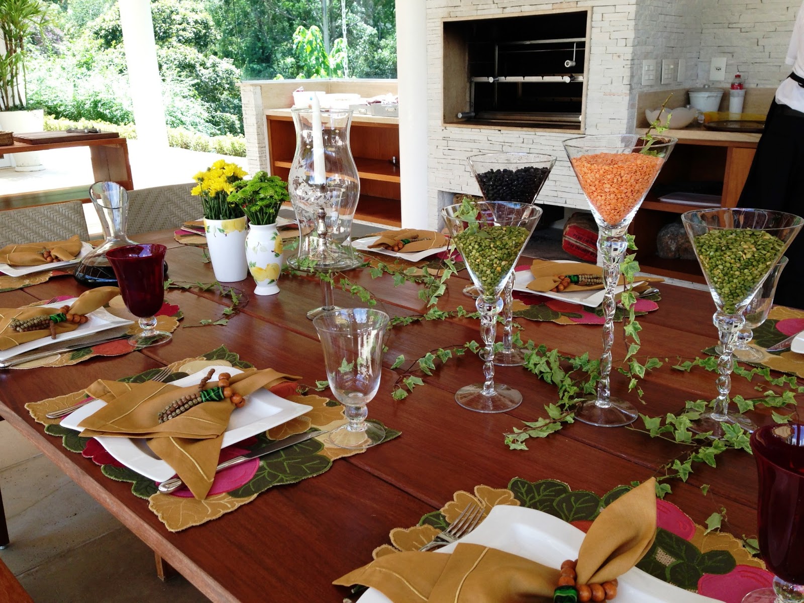 Flores e folhagens decorram parte da mesa do almoço ( um churrasco ) com elas e para o centro ela teve uma ótima ideia : Comprou lentilhas ( verdes e laranjas, essas últimas parece que não são muito fáceis de achar ) e grãos de feijão e distribuiu em taças de vidro no centro da mesa; ficou super decorativo e original, além de fácil de fazer!