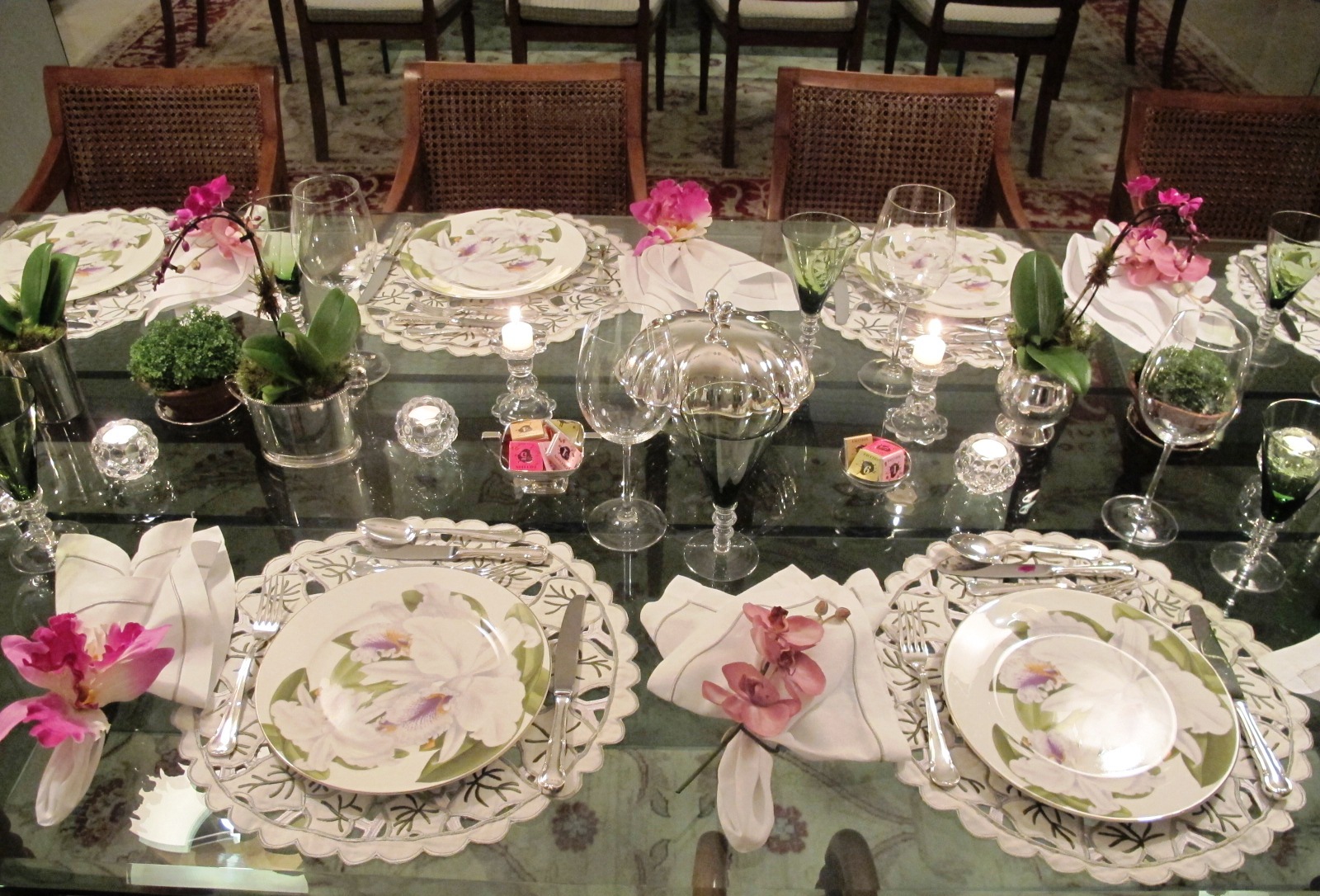 No centro, ao longo do comprimento da mesa, velas, mini castiçais, orquídeas - mini, " verdinhos " e pequenos " bowls " com chocolates.