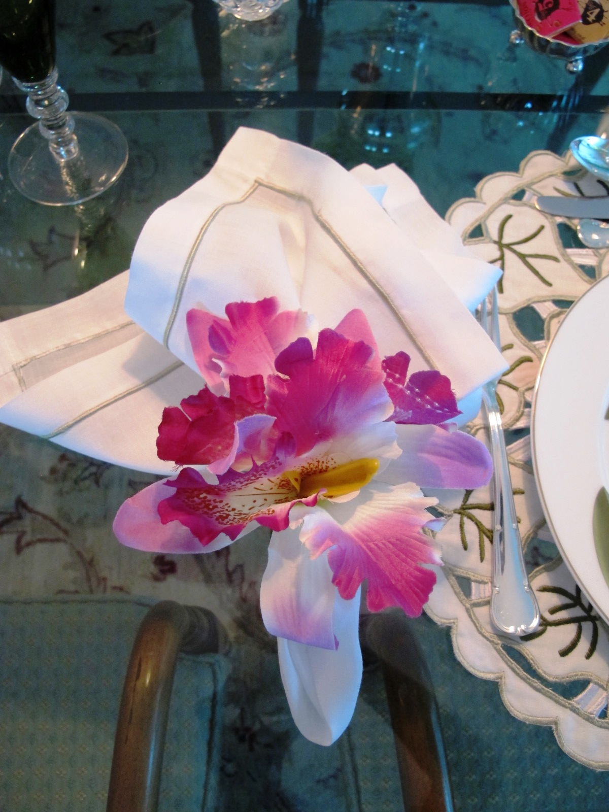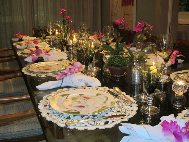 É uma decoração repleta de orquídeas, desde o desenho dos pratos até as flores do centro de mesa, passando pelos porta-guardanapos com duas espécies dessa flor, falenópsia e catléia.