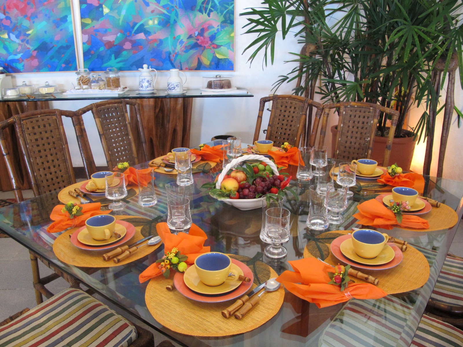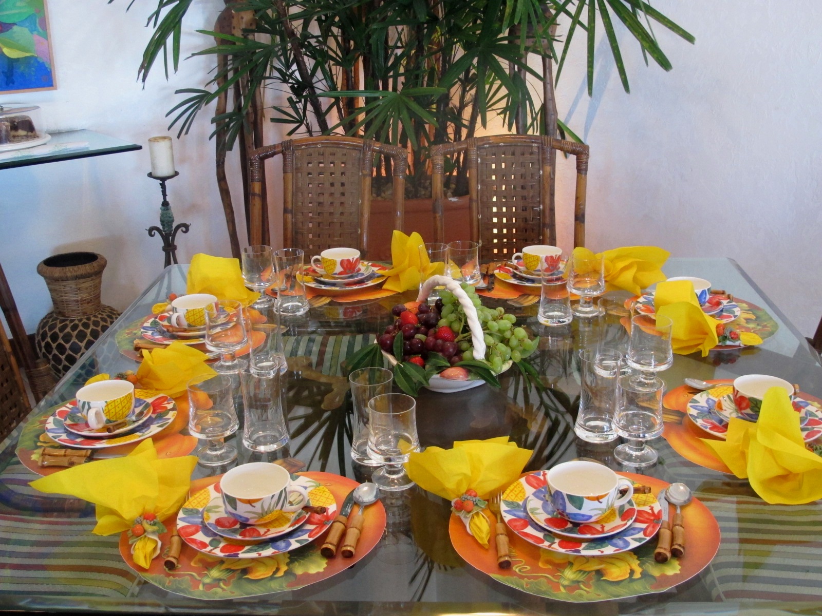 O CENTRO DE MESA É SEMPRE UMA CESTA COM FRUTAS LAVADAS PARA AS PESSOAS SE SERVIREM À VONTADE