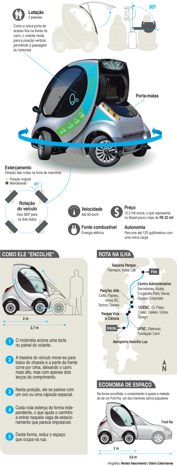 O pequeno automóvel ainda não é comercializado e deverá passar por testes nos próximos meses em parcerias como a prevista para Florianópolis. O que falta para o Hiriko chegar a Florianópolis é um estudo de viabilidade, necessário à implantação de qualquer projeto viário a ser implantado na cidade.