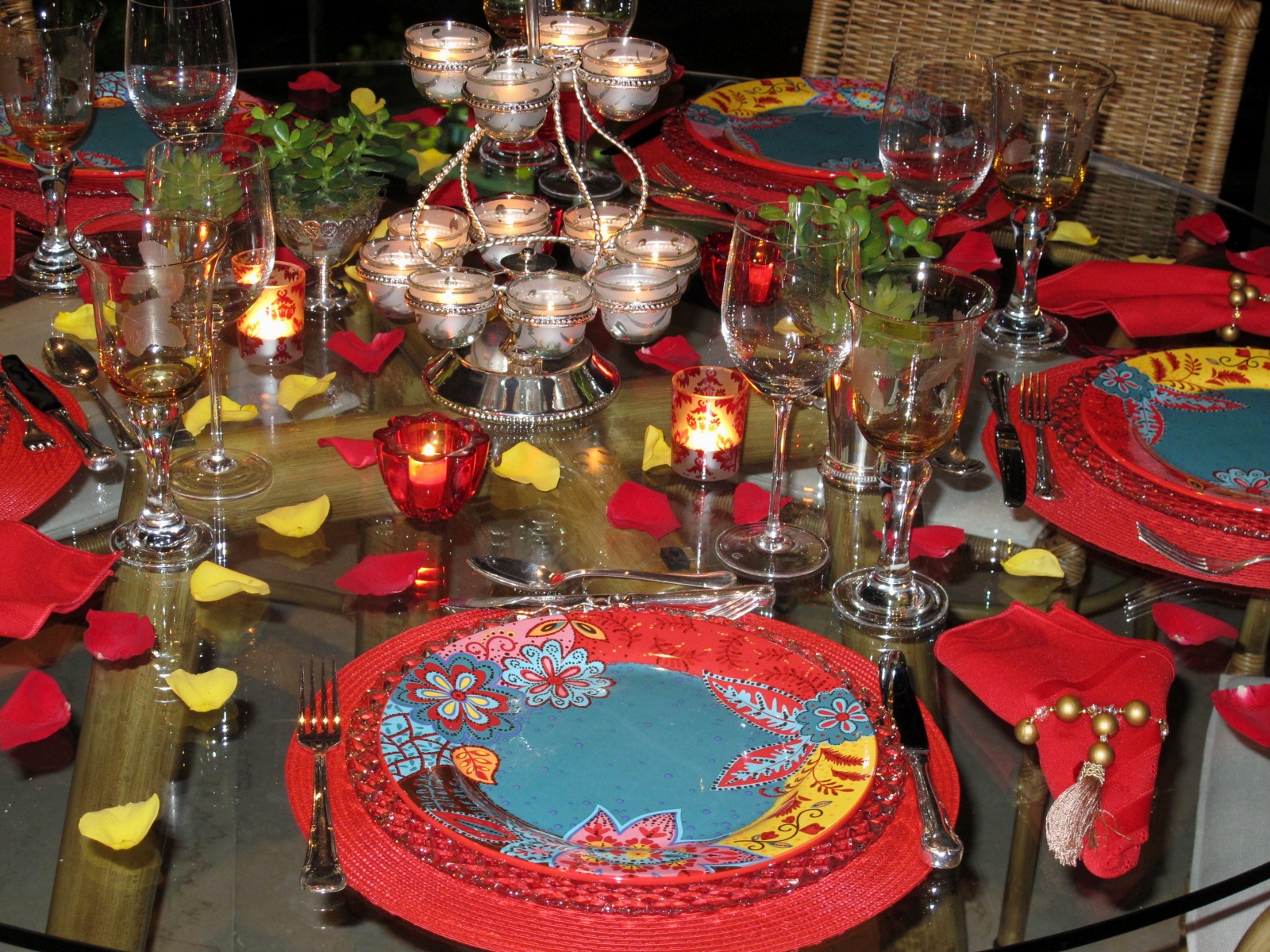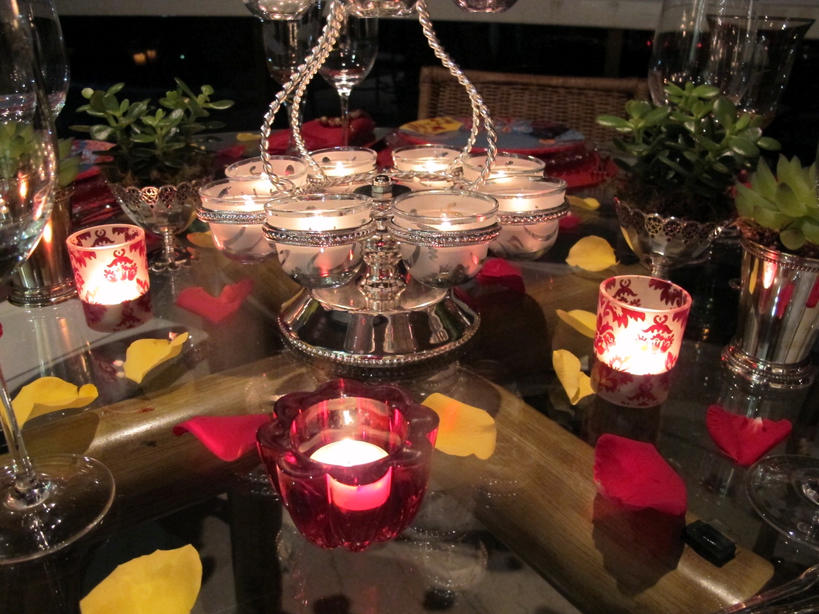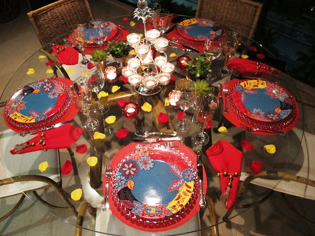 VELAS EM VERMELHO AO REDOR E PÉTALAS ESPALHADAS POR TODA A MESA