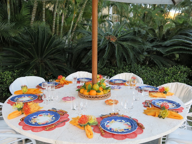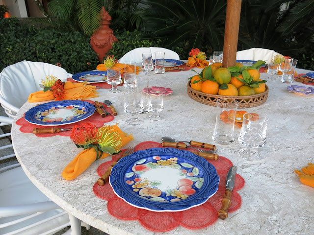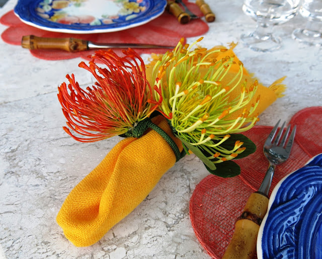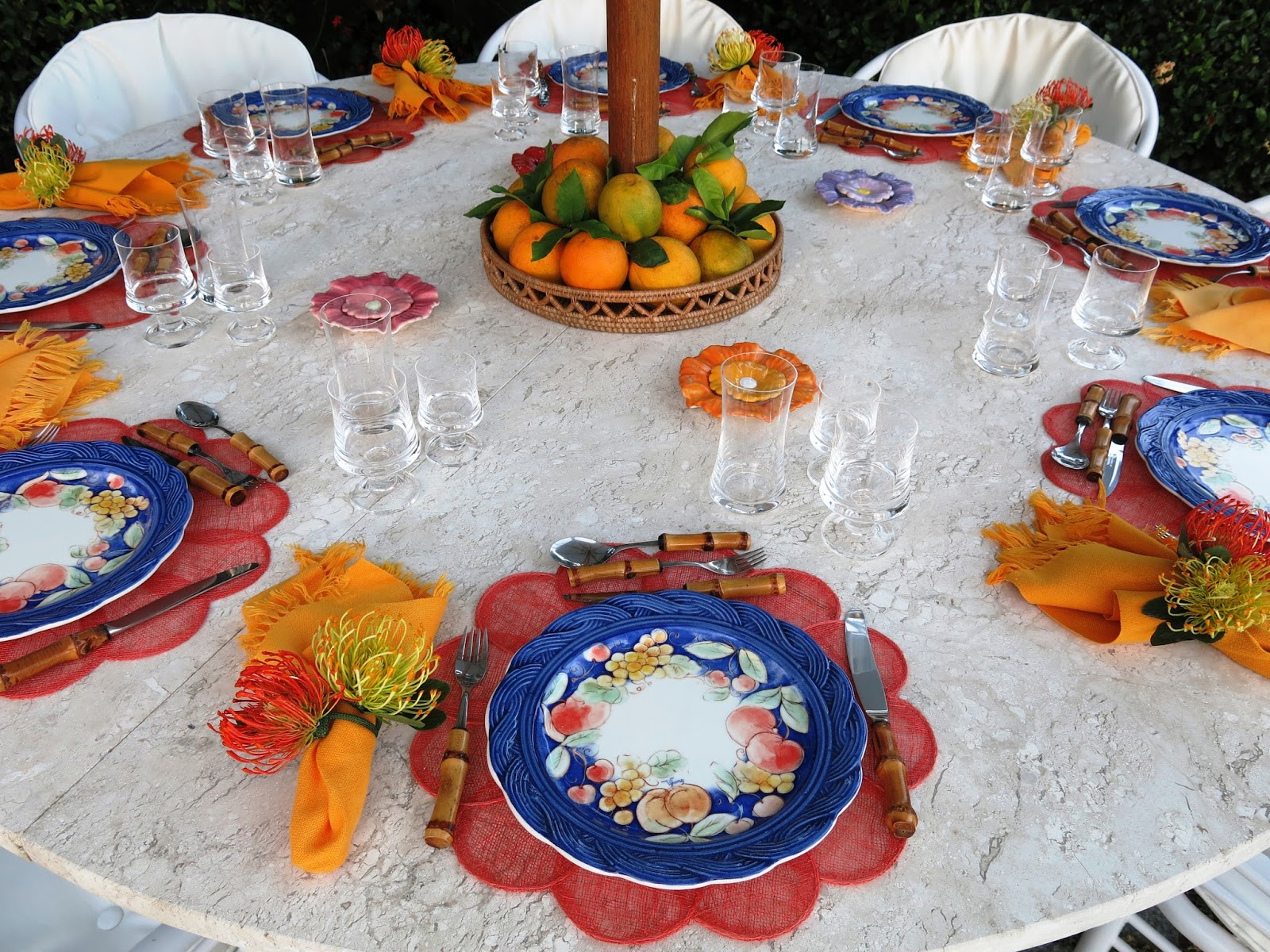 Jogos americanos laranja de palha fininha, pratos de cerâmica em azul, laranja e amarelo, guardanapos de linho grosso franjado e porta guardanapos duplos, dois crisântemos, um amarelo e outro laranja .