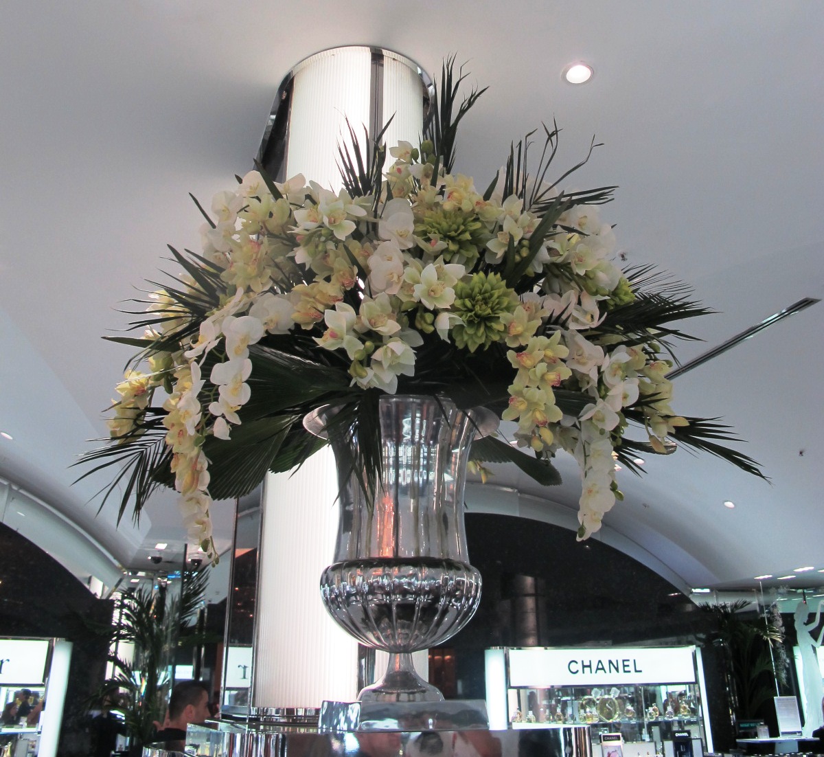 ORQUÍDEAS PHALENÓPSIAS E CYMBIDIUNS COM FOLHAS DE PALMEIRAS