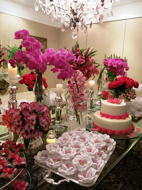 Um "mix" de flores nos tons pink e vermelho, muitas velas em castiçais de prata e mini "candles" espalhadas "partout" pratos em alturas diferentes com uma variedade enorme de doces, tarteletes e docinhos além do bolo lindo e delicioso by MALU fizeram com que a mesa fosse a estrela da tarde!