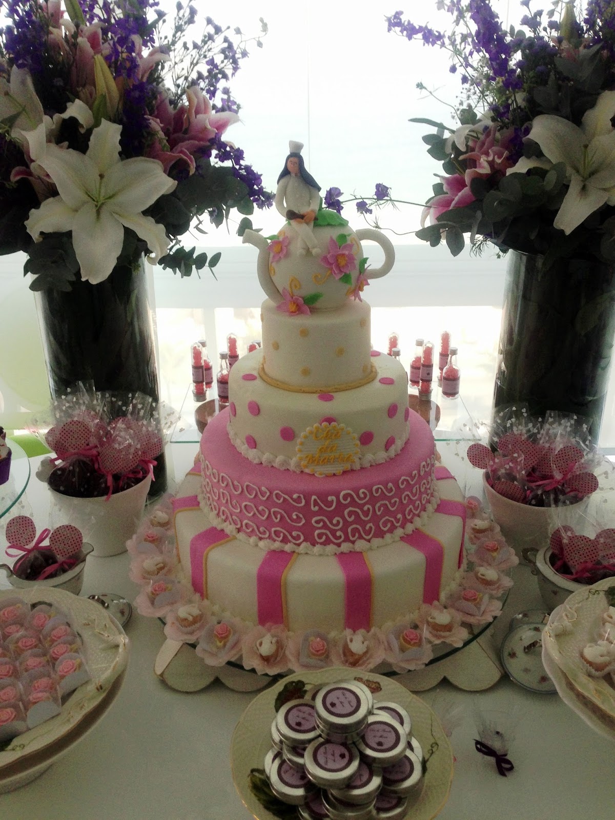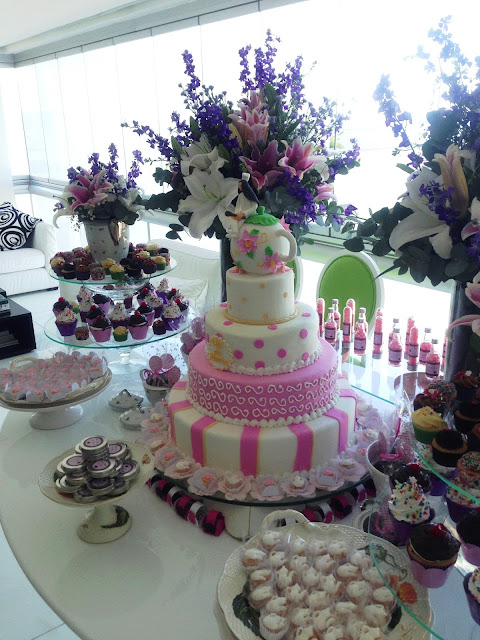 A mesa foi toda decorada em tons de rosa e lilás e o ponto alto foi o enorme bolo no centro, obra da super querida MALU.