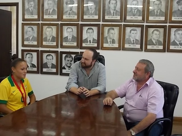 Digna de desfilar em carro aberto e receber os maiores re- conhecimentos, a jovem Camila, de 19 anos, que iniciou sua carreira em São Bento do Sul, tendo inclusive passado pelas orientações do técnico Gibito na Escolhinha do Falcão (Colégio Global), na manhã de hoje, visitou a redação do Evolução acompanhada pelo pai orgulhoso Edson Luiz Pereira. A lateral esquerda que foi titular em todos os jogos, ficando fora apenas de um jogo, penalizada por cartões amarelos, pode mostrar todas as suas qualidades em campo e ganhou a confiança do técnico. Olheiros de outros países acompanharam as disputas e Camila inclusive já recebeu proposta para jogar no Uruguai. “Eu e mais cinco atletas do Kindermann de Caçador, preferimos voltar para a equipe e esperar uma nova convocação para o Campeonato Mundial que acontecerá no Canadá”, disse ela que também aspira uma convocação para a seleção principal. Na mesma manhã acompanhada pelo diretor do Evolução, Camila foi recebida pelo prefeito Fernando Tureck e seu vice Arildo Gesser. O prefeito que se preparava para viagem à Brasília ainda na tarde de hoje, abriu espaço em sua agenda para cumprimentar a jovem campeã. Camila se apreesenta em Caçador amanhã e se integra a equipe do Kinderman, para as disputas do Campeonato Brasileiro em sua segunda rodada enfrentando o Vasco da Gama do Rio de Janeiro.