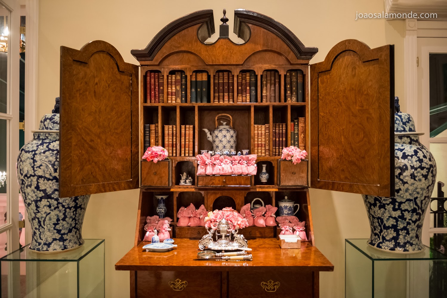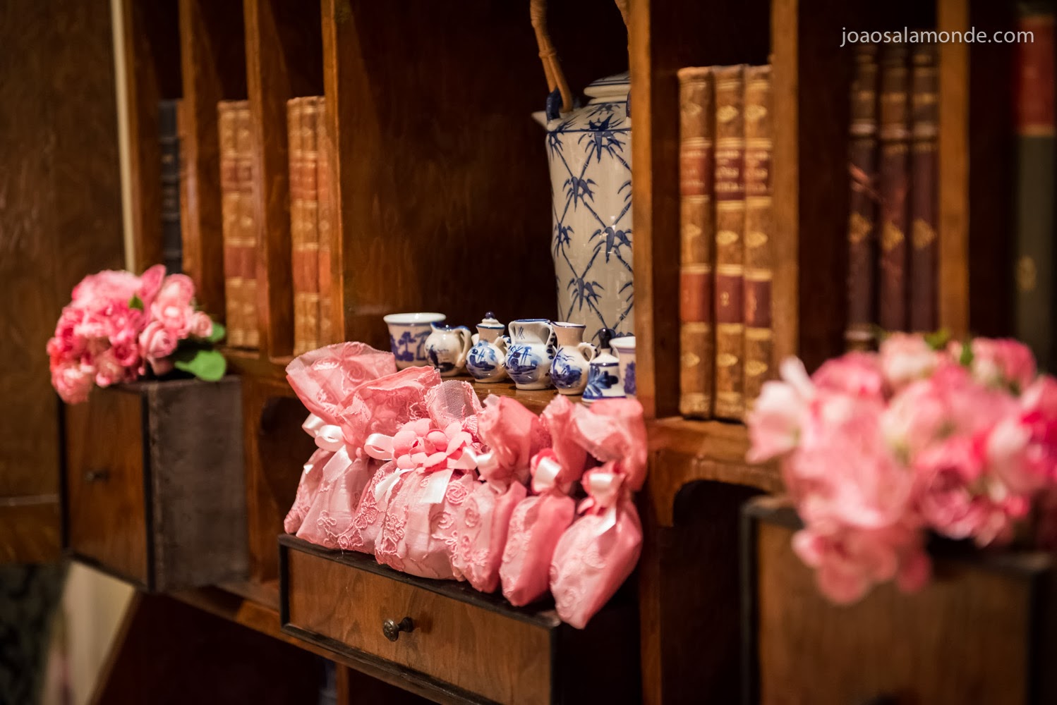 Na parte interna, a mesa de doces estava um escândalo, com vários arranjos, castiçais e pequenas peças de prata e doces em forminhas nos mesmos tons de "pink" das flores.