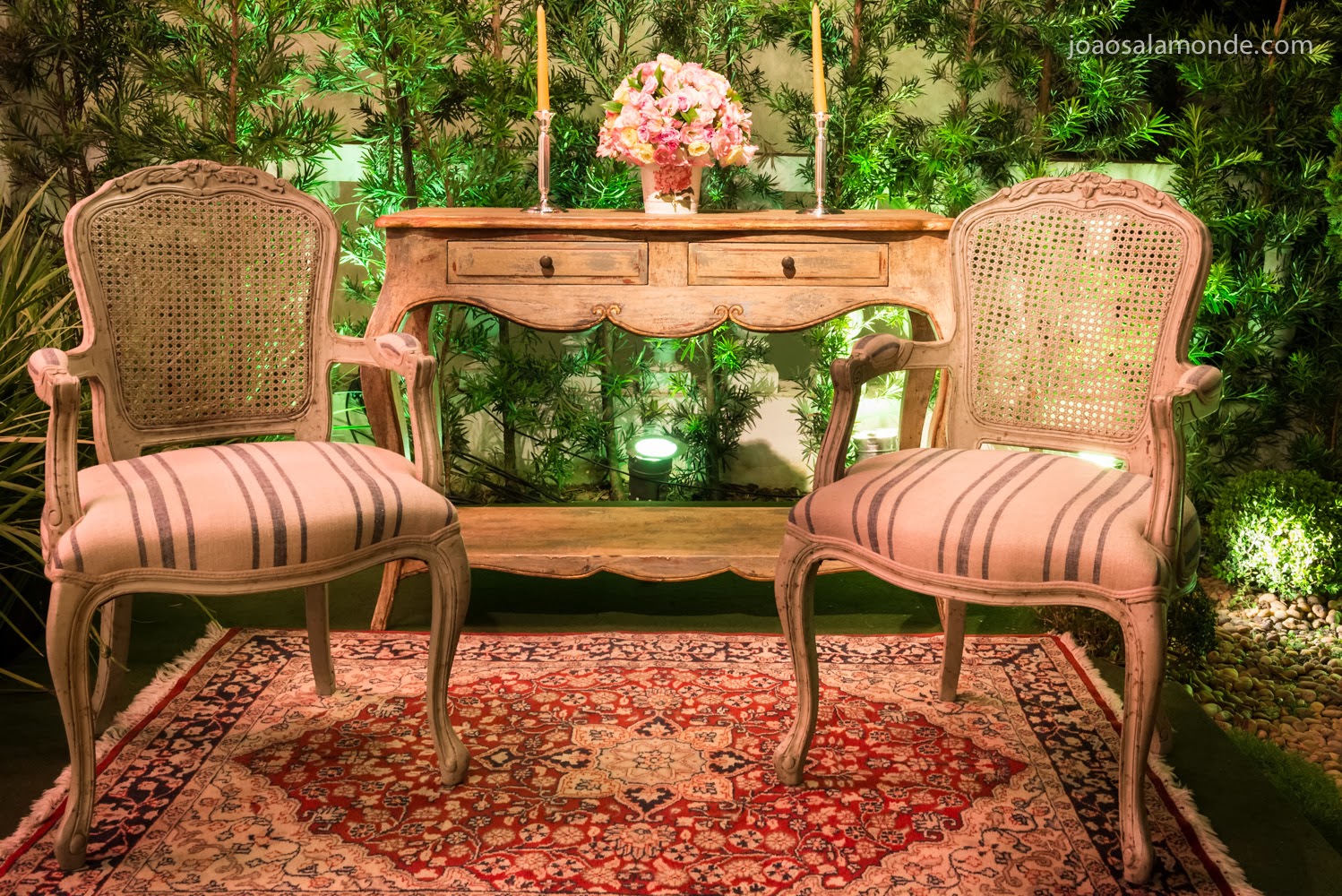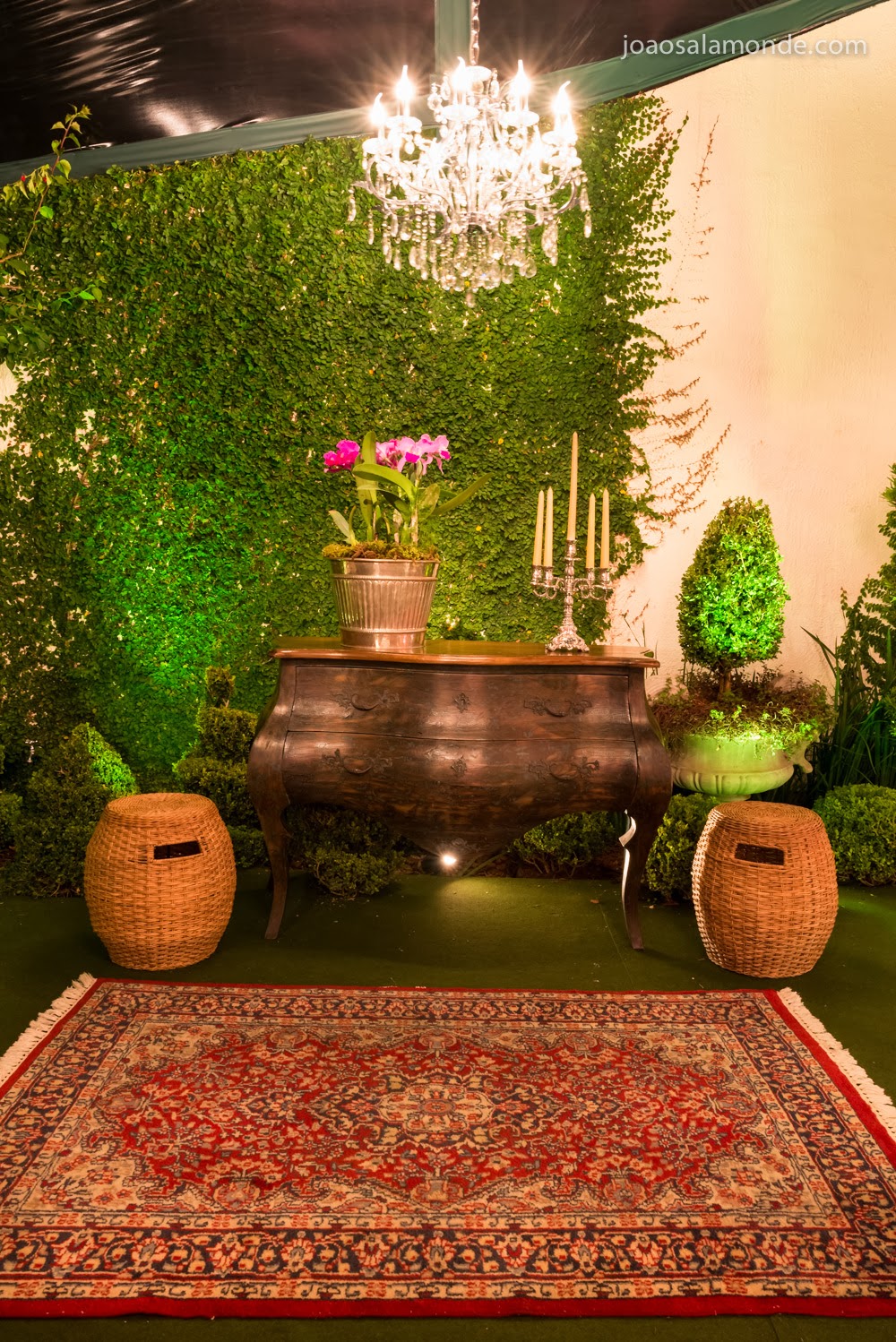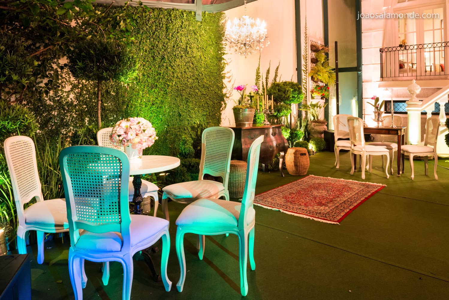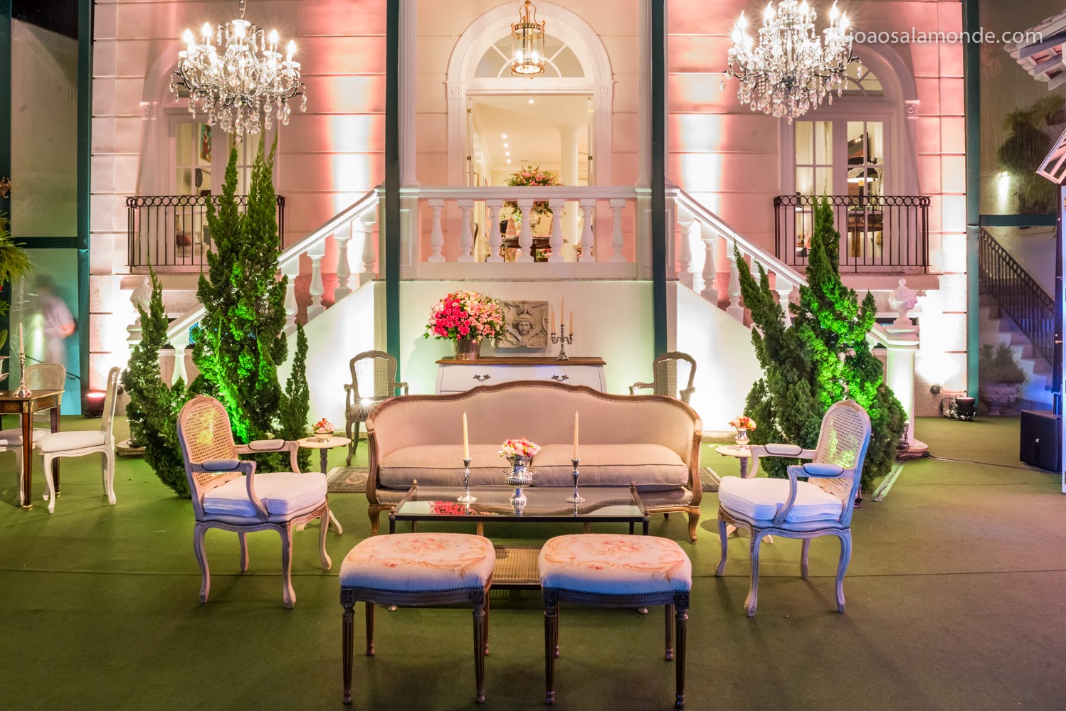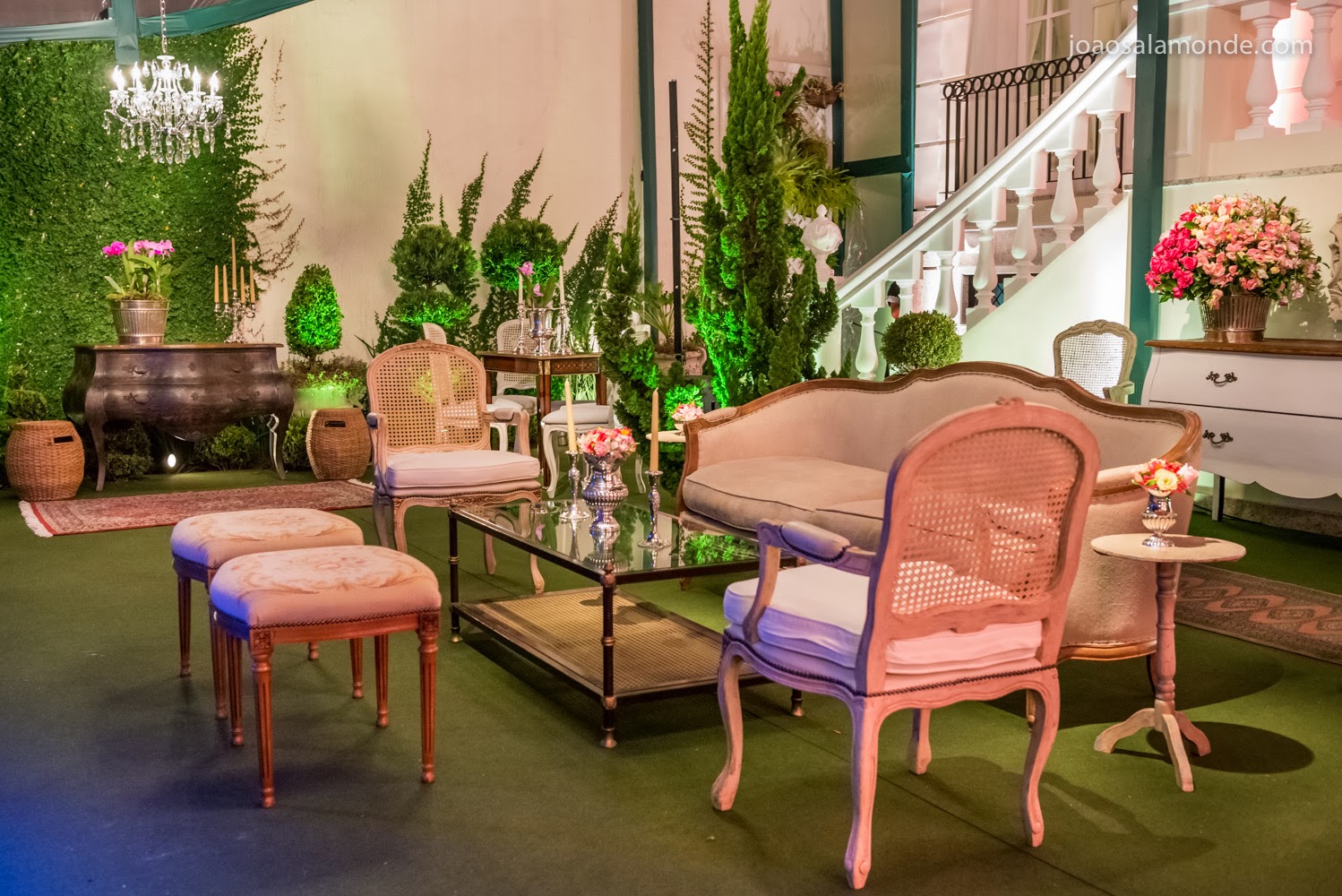 E CRISTINA se esmerou; ficou tudo lindo e foi super elogiado! Os lounges na área coberta tiveram inspiração "provençal chique" ( segundo CRISTINA ), com móveis clássicos, lustres de cristal, mutas flores em tons de rosa, buxinhos e muros de heras.