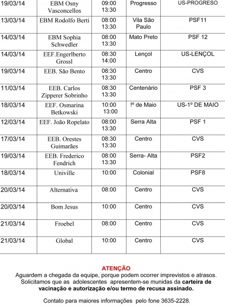 As orientações já foram repassadas a todos os diretores e responsáveis em uma reunião realizada no iniíio de fevereiro. Assim, cada escola já conta com o número completo de meninas aptas a receber a dose. “Essa é uma campanha do Ministério da Saúde e será a Vigilância que estará realizando a aplicação da dose, em um local limpo e adequado, buscando sempre a prevenção de doenças”, comenta a diretora do CVS, Luciane Scatolon.