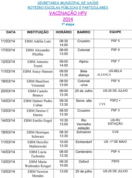 São Bento - A Escola Básica Municipal Adélia Lutz será a primeira a receber profissionais para a vacinação das crianças contra o Papiloma Vírus Humano (HPV). A programação completa foi divulgada pelo Centro de Vigilância à Saúde e inicia a partir da próxima terça-feira, 11.