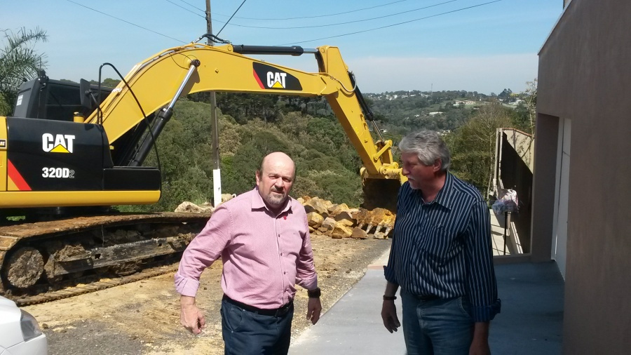 Rio Negrinho - Prefeito Alcides Grohskopf conferiu as obras que tiveram início ontem, quinta-feira 9, na rua Woehl Nunes. O problema ocasionado pelas fortes chuvas de junho trouxe muitas consequências. A grande erosão provocou desmoronamento da parte final da pista, atingindo o acesso de uma residência. Na manhã de ontem as máquinas, com bastante dificuldade adentram o terreno e começou o trabalho. Os caminhões-caçamba da prefeitura realizaram inúmeras viagens com pedra-ferro, depois cascalho e terra para então compactar o terreno. Embora as obras estejam a todo vapor a previsão é que o trabalho se estenda até a próxima semana.