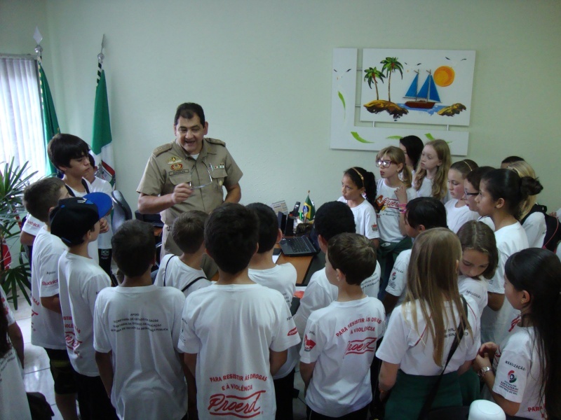 Os alunos foram recebidos pelo Comandante da unidade Tenente Coronel PM Amarildo de Assis Alves, onde o mesmo deu as boas vindas aos alunos Proerd e promoveu uma troca de informações sobre curiosidades em relação às atividades da Polícia Militar.