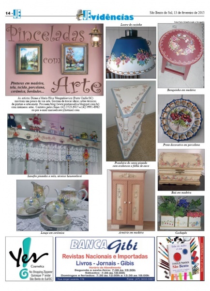 As artistas Dione e Maria Elisa Wengerkievicz (Porto União/SC) mostram um pouco de sua arte. Gostam de trocar ideias sobre técnicas de pintura e artesanato. Possuem blog (www.pinturaselisa.blogspot.com.br) com inúmeras artes. Contatos pelos fones (42) 3523-9015 e (42) 9991-8982 ou por e-mail mariaelisaw@hotmail.com