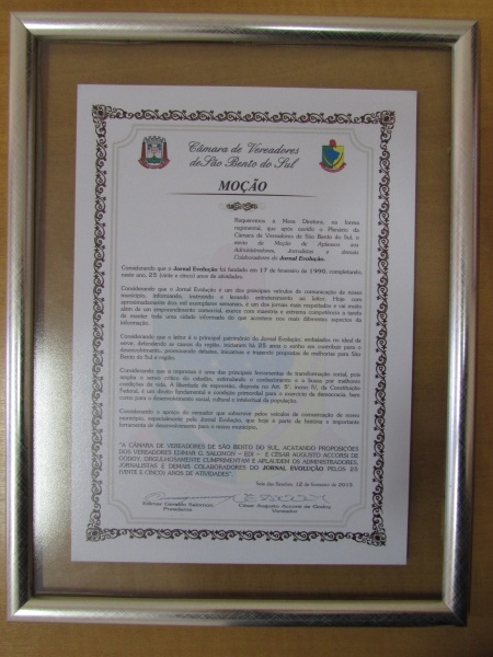 Temos orgulho de muitas parcerias e reconhecimentos. Nossos leitores, colunistas, colaboradores, patrocinadores são nosso maior patrimônio. Nunca ficamos fora de alguma causa que represente o interesse da comunidade. Quem lê e nos acompanha sabe. Quem não leu, talvez um dia ficará sabendo. Obrigado a todos que se manifestaram com suas mensagens e em especial ao vereador Edimar Salomon, presidente da Câmara de Vereadores de São Bento do Sul e aos demais edis pela homenagem prestada.