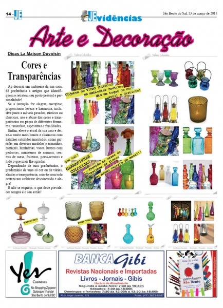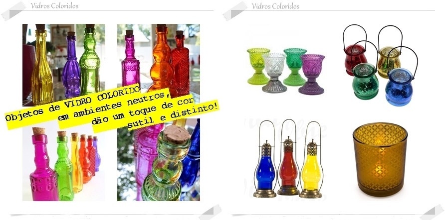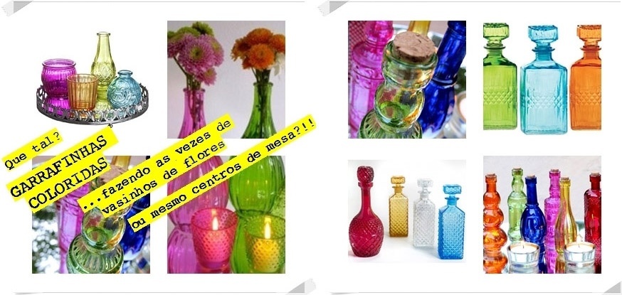 Enfim, eleve o astral da sua casa e deixe-a muito mais bonita e charmosa com detalhes coloridos inusitados, como garrafas em diversos modelos e tamanhos, castiçais, luminárias, vasos, lustres com pedrarias, miniaturas de animais, centros de mesa, fruteiras, porta-retratos e tudo o que mais lhe agradar.
