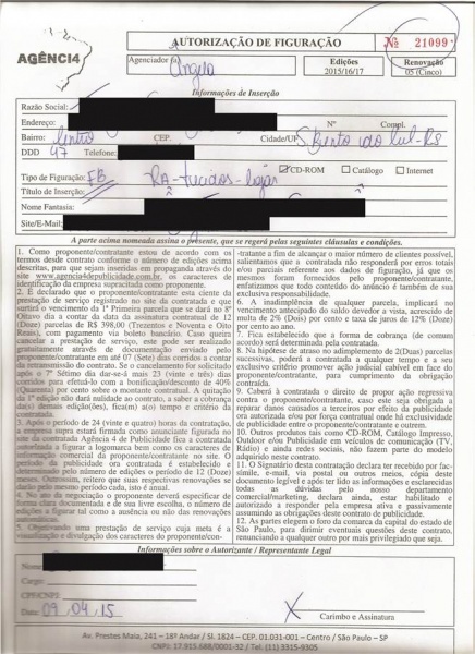 Nunca assinem nada antes de ler! O Sindilojas alerta a todos que várias empresas estão recebendo ligação de uma “suposta agência” solicitando a atualização dos dados para lista telefônica, na ligação a pessoa cita que não haverá custo algum. Eles vão solicitar um e-mail ou fax para enviar um contrato, eles pedem para assinar o mesmo e retornar a “agência” em seguida. Por favor não assinam nada sem antes lerem o contrato. Essa atualização que seria gratuita terá um valor de 12 parcelas de R$ 398,00, caso retorne o contrato assinado para a “suposta agência”. Abaixo segue o modelo do contrato que está sendo enviado.