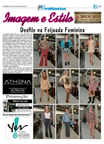 No sábado, dia 16, as lojas Dona Encrenca Boutique e Athena Calçados juntamente com seus parceiros Uniquehair, Joy Fotografia, Linda Tomelin, Shopping Zipperer, Griff Eventos, realizaram em São Bento do Sul um grande desfile durante o evento Feijoada Feminina realizado pelo clube Bolão Mágico, na Sociedade Guarani. O desfile apresentou para mais de 500 mulheres, tendências e novidades em roupas, calçados, cabelos e maquiagens para a nova estação. Nas roupas tecidos leves como a seda e a renda, ou tecidos pesados como couro, lã e o moletom, esse que por sinal tem sido um dos grandes protagonistas da estação por serem bem confortáveis. Cores, bordados, franjas, transparências e estampas se misturam deixando os looks super modernos, despojados e fashions.