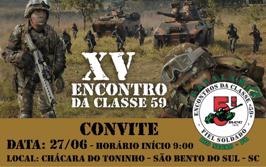 São Bento – Será neste sábado, dia 27, o XV Encontro da Classe 59. Ex-soldados que serviram o Exército no 5º RCC, em 1978 se reunem para confraternizar e relebrar histórias vividas naquele ano de Regimento Militar. Envolve aproximadamente 100 participantes entre ex-soldados e familiares.