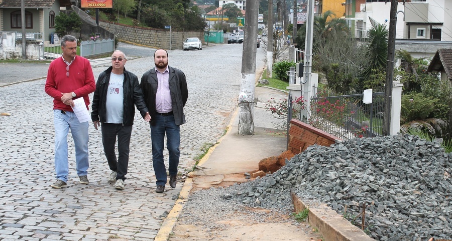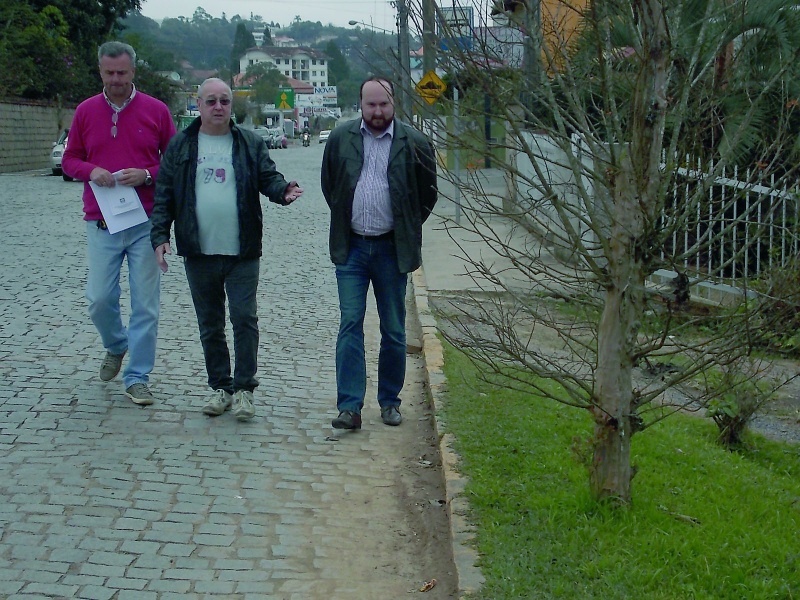 São Bento – O prefeito Fernando Tureck aceitou o convite do jornalista Pedro Skiba para caminhar por algumas ruas do município e conferir de perto os problemas de acessibilidade. O secretário de Planejamento e Urbanismo, Cássio Luiz Zschoerper, também acompanhou o trajeto, na manhã de quinta-feira (2). Nas ruas Jorge Zipperer, Thomaz Vidal Teixeira e Castro Alves, obstáculos como árvores, telefones públicos, pontos de ônibus e materiais de obras em construção dificultam a passagem dos pedestres pelas calçadas. Em outras situações é a falta ou má conservação dos passeios que atrapalham a mobilidade. Para incentivar os cidadãos a adequarem suas calçadas, a prefeitura iniciou a Campanha Passeio Legal.