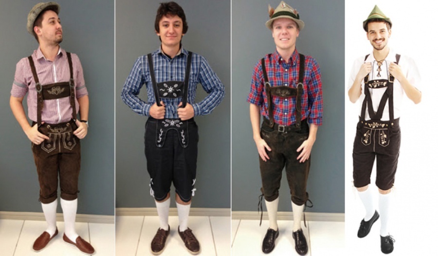 O traje masculino é composto por bermuda (de veludo, sarja, couro, brim, etc.) com suspensório da mesma cor; camisa de tecido, curta ou comprida, na cor lisa ou xadrez com colarinho. Obrigatório o uso de meias com sapatos fechados, marrons ou pretos. O chapéu é opcional.