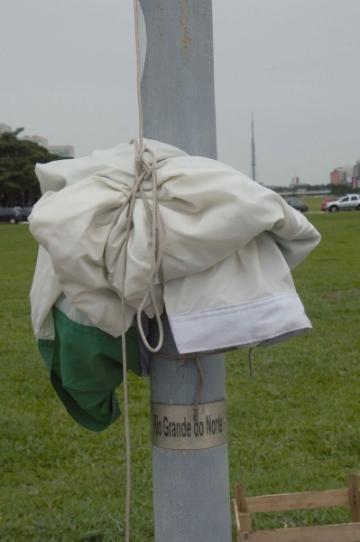 Esta é a situação em que se encontrava a bandeira do estado do Rio Grande do Norte, na Alameda dos Estados, em Brasília dia 30/12/15. Quando muita gente já prega o separatismo, é de se perguntar o que teria feito o povo potiguar para merecer tamanho desrespeito? Seria a falta de funcionário? Esta imagem com o comentário foram enviados para a Presidência da República e para o governo do estado do Rio Grande do Norte. A Presidência acusou o recebimento.