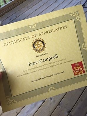 Hoje eu tive a oportunidade de falar no Rotary Club de Ottumwa sobre as minhas viagens para Budapeste e profissão. Como sinal de agradecimento, uma doação foi feita em meu nome para imunizar 10 crianças com a vacina contra a poliomielite. Estou sensibilizado com a sua gratidão e a honra de chamar o Ottumwa Rotary Club parte integrante da minha comunidade.