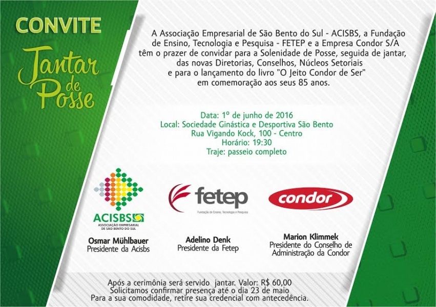O Sistema Fecomércio SC – Sesc/Senac e o Sindicato do Comércio Varejista de São Bento do Sul e Campo Alegre convidam as lideranças empresariais, autoridades e imprensa para almoço de relacionamento com a presença do presidente do Sistema Fecomércio SC, Bruno Breithaupt, do diretor-executivo da Federação, José Agenor de Aragão Junior, do diretor regional do Sesc, Roberto Anastácio Martins, e do diretor regional do Senac, Rudney Raulino. Dia 10, 12:00, Adega e Restaurante Alpenbier.