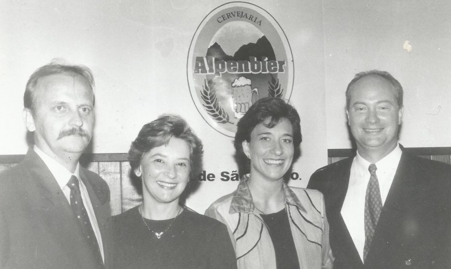 Uwe Stortz e Vivian, proprietários e Ilse e Norie José Gabardo, no lançamento da Cerveja Alpenbier, hoje Adega e Restaurante Alpenbier, em março de 1998.