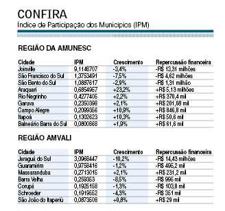 Na região Norte do Estado, o destaque positivo fica por conta de Araquari, que teve o maior incremento no índice entre todos os 295 municípios catarinenses: alta de 22,3%. O IPM passou de 0,556% para 0,685% e isso é efeito da entrada em operação da fábrica de automóveis da BMW, tendo a empresa de devolver fatia do benefício fiscal a ela concedida quando da sua implantação. Isso representará R$ 5 milhões a mais no caixa no próximo ano. Dado relevante surge com Porto Belo, no Litoral Norte: é o segundo município com maior crescimento em todo o Estado: +19,7%, graças ao impulso da indústria pesqueira e também à recuperação de valor adicionado, omitido em anos anteriores e objeto de autuação pelo Fisco.