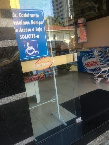 Uma ideia simples, bem pensada, racional, barata, que resolve e serve de exemplo para todos os lugares onde deve haver acessibilidade. Sinal de respeito com os cadeirantes e que merece ser copiada e multiplicada. Um estabelecimento comercial em Porto União -"CASA DE FRUTAS E VERDURAS DO PORTO". Parabéns pela iniciativa que mostra que respeito é bom e todo mundo merece. A rampa é móvel, não atrapalha a calçada e só é colocada facilmente quando o cadeirante solicita. Após o uso é novamente guardada.
