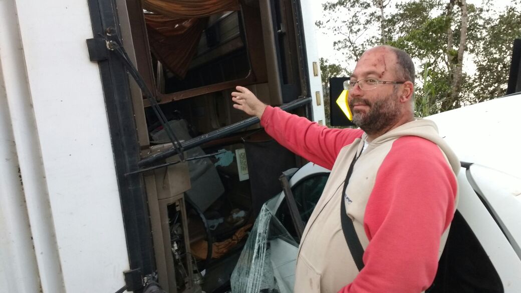 Assustado, Cléber (foto abaixo) disse que ouviu um estampido dentro do ônibus momentos antes da batida. O veículo perdeu os freios e só parou quando encostou no carro de Renato. Segundo ele, o ônibus tem quase 30 anos de uso e estava com as revisões e a documentação em dia.
