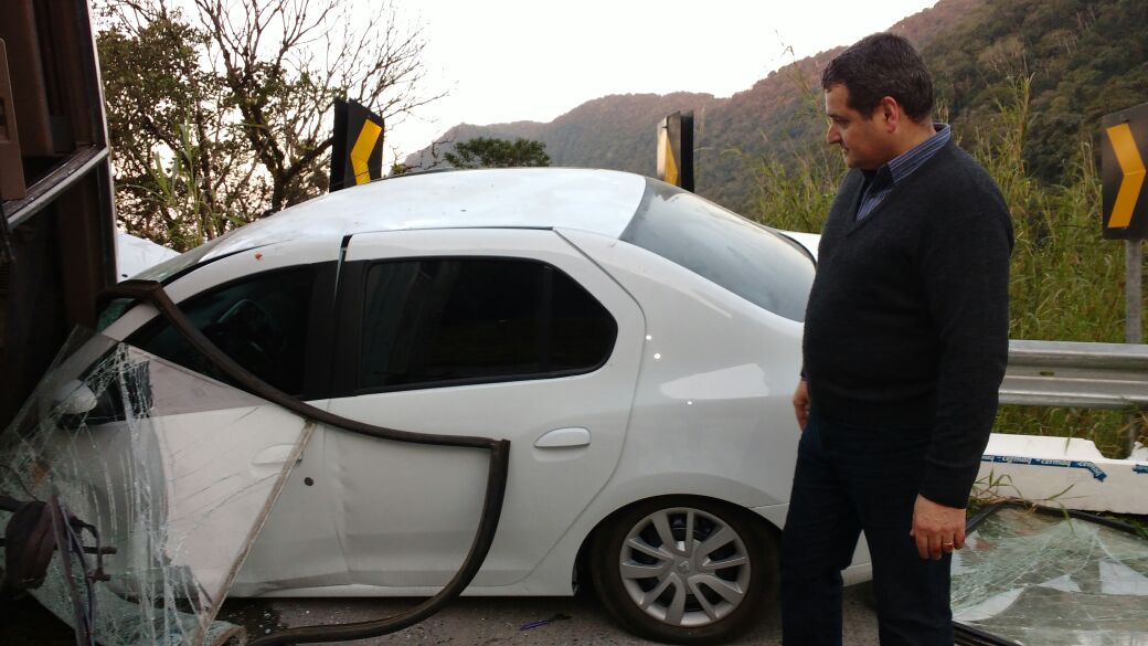 Renato, que dirigia o carro, um Renault Logan, tentou desviar. Puxou o veículo para o lado direito da pista, próximo à grade de proteção. Mesmo assim, não conseguiu evitar a colisão e o ônibus parou em cima do motor do carro, a centímetros de distância dele e da mulher, e muito próximo de um penhasco.