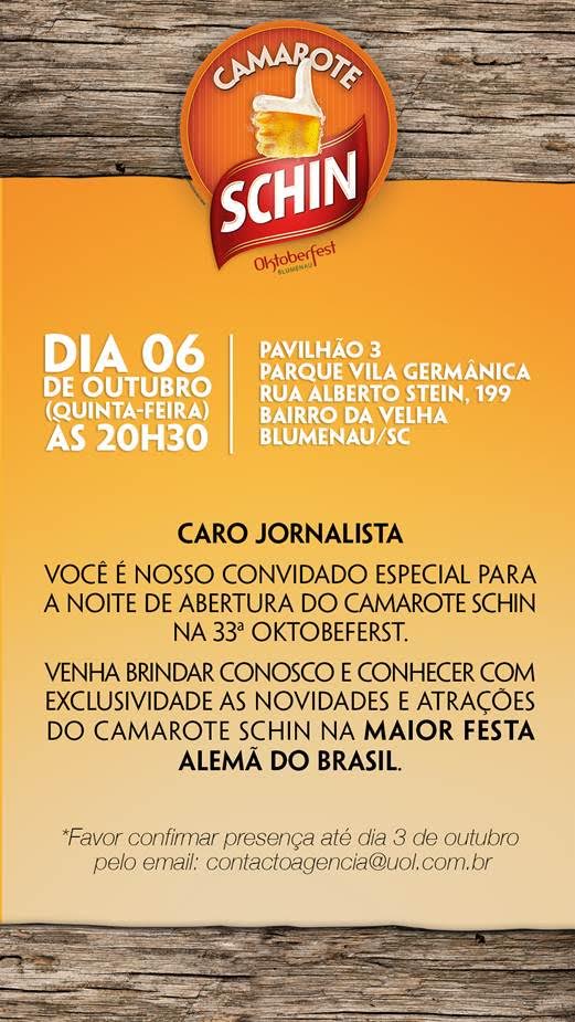Olá,Está chegando mais uma edição da Oktoberfest e queremos contar com a sua presença no Camarote Schin no dia 6/10 (quinta-feira).Segue abaixo o convite, aguardo a confirmação de presença por email.Abraços, Luciana Haug