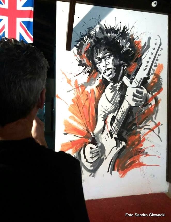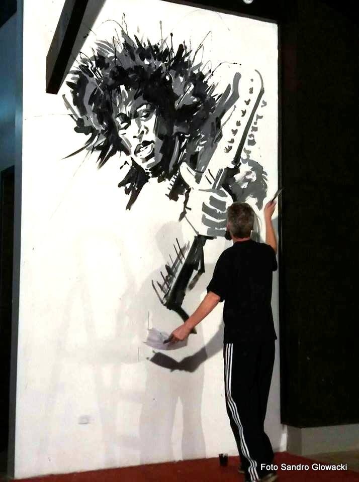 Na ultima quinta-feira(24/11) o Artista Rio-Negrense Rogelis Arbigaus esteve no Café no Bule Pub & Grill em Rio Negrinho, a convite dos amigos Zimba e Dido para realizar mais uma de suas obras, uma pintura do cantor Jimi Hendrix, um dos melhores guitarristas da história, em uma parede medindo 3,40m de altura x 2,10m, de largura ele deixou seus traços para que todos que frequentarem o Pub possam admirar sua arte.