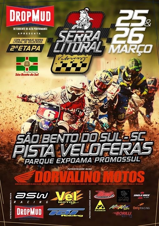 A segunda etapa da Copa Serra Litoral de Velocross acontece nos dias 25 e 26 de março, na cidade de São Bento do Sul-SC. A pista muito conhecida e elogiada pelos pilotos ja recebeu provas do Campeonato Brasileiro, Estadual e diversas outras provas da modalidade. Serão 20 categorias em disputa, 19 que valem pontos pelo campeonato e uma categoria extra que vai correr no sábado, válida para os pilotos da região com motos nacionais.