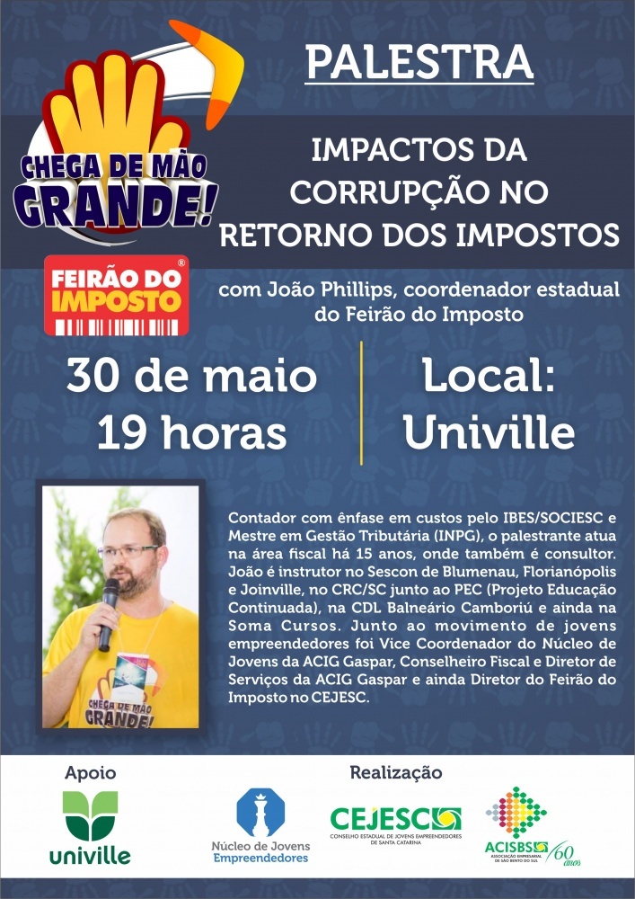 Dia 30.05 – Palestra gratuita ‘Impactos da corrupção no retorno dos impostos’, com o coordenador estadual do Feirão do Imposto, João Phillips, dia 30, às 19 horas, na Univille.
