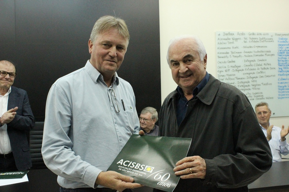 Homenagens – o presidente MárioNenevê despede-se da presidência da Acisbs, encerrando seu mandado neste mês. Portanto, como forma de agradecimento, realizou duas homenagens durante a edição dos Diálogos Institucionais, para o Sebrae e Jornal A Gazeta, pela parceria e apoio nas ações da classe empresarial. O gerente do Sebrae, Luiz Carlos da Silva, e o diretor do jornal, Cesar Celeski, receberam um certificado de agradecimento. As homenagens foram entregues pelos membros do Conselho Superior da Acisbs, o presidente Álvaro Weiss e Osmar Mühlbauer.