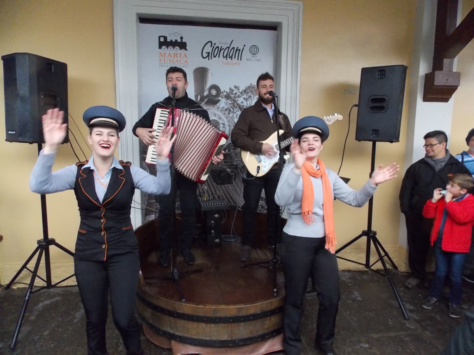 Na estação ferroviária de Garibaldi (RS), músicos com as belas recepcionistas e que acompanham a viagem até Carlos Barbosa.