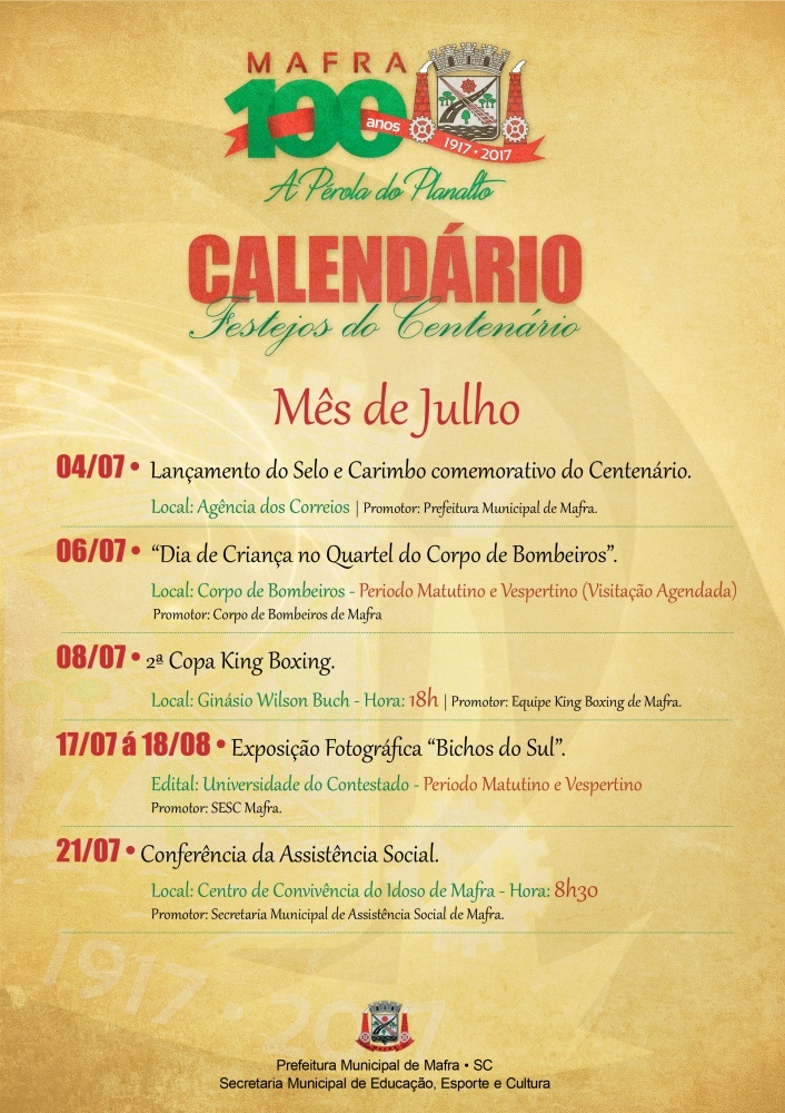 A Prefeitura de Mafra divulgou através da Secretaria Municipal de Educação, Esporte e Cultura, o calendário dos festejos do centenário do município, com os eventos programados para o mês de julho deste ano.