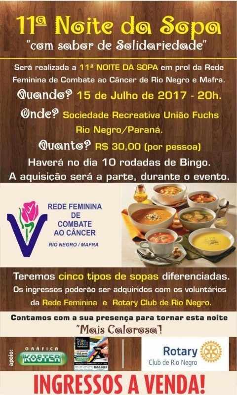 O Rotary Club de Rio Negro organiza a 11ª Noite da Sopa “com sabor de solidariedade” em prol da Rede Feminina de Combate ao Câncer de Rio Negro e Mafra. O jantar acontece no próximo dia 15 de Junho (sábado), às 20 horas, na Sociedade Recreativa União Fuchs em Rio Negro.