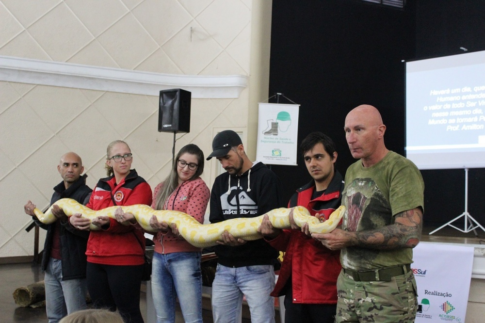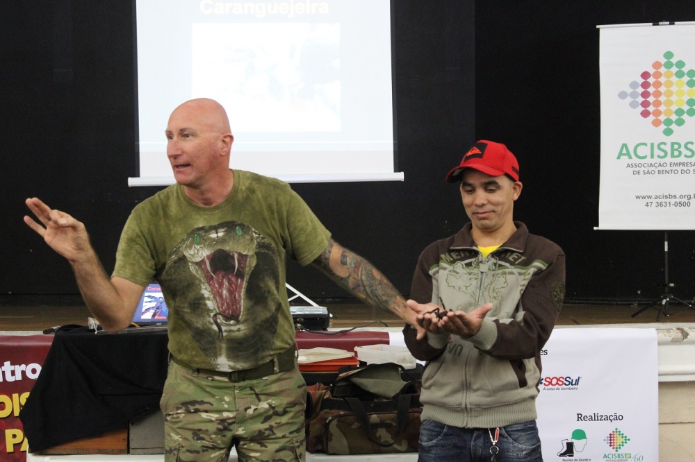 A segunda palestra, Animais Peçonhentos, com o professor Amilton Berkenbrock, foi um show à parte. Ele levou aranhas, sapos e cobras vivas para tratar do tema. O público interagiu, segurando os animais e conhecendo as características de cada um. Amilton disse que a região é propícia para diversos animais peçonhentos, mas falou que são importantes para prevenir o controle de doenças. “As serpentes comem os ratos, responsáveis por transmitir mais de 40 tipos de doenças” frisou. Ele ainda tratou de mariposas e águas-vivas. No Brasil, segundo ele, a caravela foi a campeã em acidentes durante o último verão. “É venenoso, mas não peçonhento. Vinagre é indicado para aplicar na região afetada ou areia seca. O problema está em coçar, não se deve coçar” explicou.
