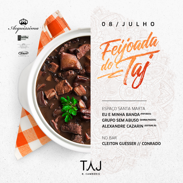 5/7- Quarta Gold e Quarta OrientalA Quarta Gold já é um sucesso das noites do TAJ, e quem agita o Espaço Santa Marta nesta noite é Rodrigo Valentim, a dupla Leandro e Evandro, LBoy e ainda MK.Já no bar principal além da Quarta Oriental, com todo o cardápio do Sushi com 50% de desconto o som é comandado pelos DJ’s Maycon Schramm, Siviera e Boo. Um noite para esquentar a orla de Balneário Camboriú.6/7 – QUINTA PHARMACY – Lançamento da nova carta de drinksNesta Quinta Pharmacy, o bar que virou a sensação entre os habituès do TAJ, lança sua nova carta de drinks, com novidades incríveis de coquetéis ultramodernos e para embalar a noite repleta de novidades o som chill & lounge music é da expert DJ Ju Lopes.7/7 - HOUSE FRIDAYComece o final de semana em grande estilo com um mixde música eletrônica e saxofone no melhor bar do Brasil. AHouse Friday desta semana tem TAJ Tour com os Dj’sCleiton Guesser e Raff acompanhados do saxofonistaJames McÁlister.8/7 – SATURDAY NIGHT OUTA noite mais prestigiada da orla vai ferver com o Saturday Night Out, que terá o som chill & lounge music dos Dj’sMaycon Schramm, Nav e Hiorrana.9/7 - CLASSIC SUNDAY / VEM PRO SAMBAE o domingo do TAJ encerra o final de semana fervido. No Espaço Santa Marta o som do Vem Pro Samba será comandado pelo grupo Destak, com o cantor Rafa Machado e o Dj Kley.Já no Bar principal a noite é de Classic Sunday com o fera das pistas Dj Nav.Entrada:Das 18h às 19h30min feminino R$5,00 masculino R$10,00Das 19h30min às 21h feminino R$10,00 masculino R$20,00;Das 21h às 23h feminino R$20,00 masculino R$40,00Das 23h à 00h feminino R$30,00 masculino R$60,00;Após à 00h feminino R$40,00 masculino R$80,00.*Valores sujeitos à alteração conforme o movimento e lotação da casa.