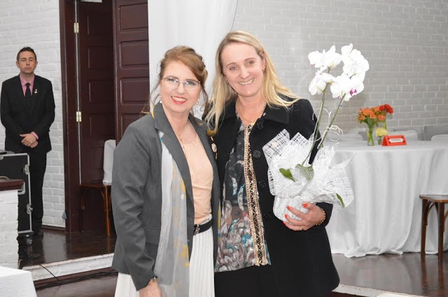 Nelsi Wilsmann, esposa do novo Governador entregando uma lembrança para Sandra Gelinski, organizadora do evento