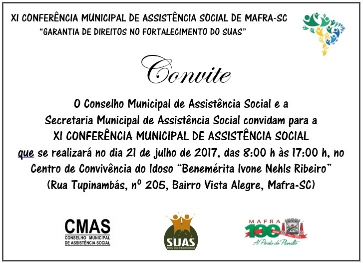 Acontece no dia 21 de julho a XI Conferência Municipal de Assistência Social, no Centro de Convivência do Idoso “Ivone Nehls Ribeiro”, das 8 às 17 horas. O evento terá como tema "Garantia de direitos no fortalecimento do SUAS - Sistema Único de Assistência Social".