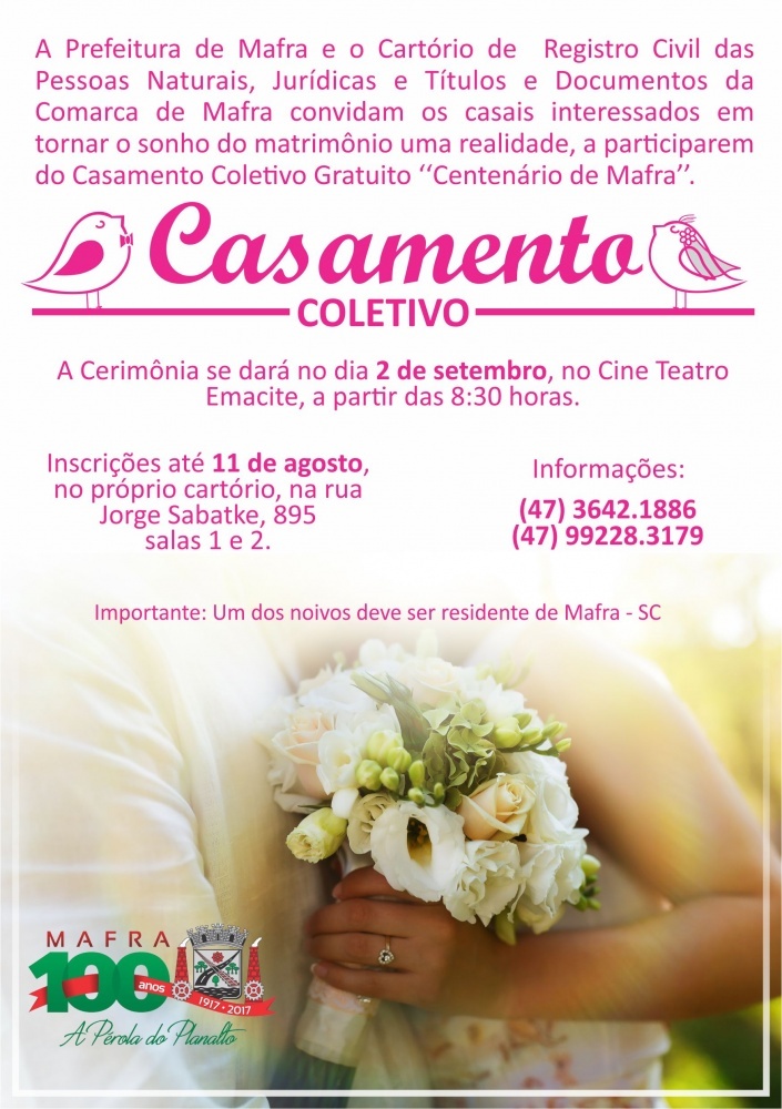 O Cartório de Registro Civil das Pessoas Naturais, Jurídicas e Títulos e Documentos da Comarca de Mafra e a Prefeitura de Municipal programaram para o dia 2 de setembro, no Cine Teatro Emacite, o Casamento Coletivo Gratuito -Centenário de Mafra. O evento faz parte do calendário de festividades relativas aos 100 anos da cidade.