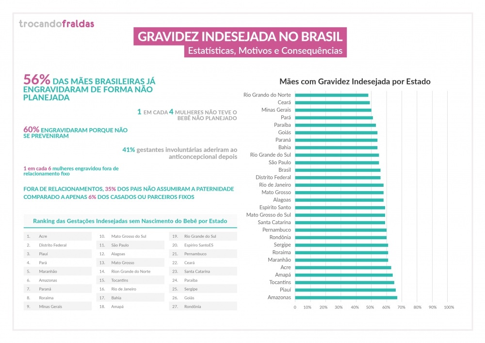 Conduzida pelo portal especialista em saúde feminina Trocando Fraldas, pesquisa revela que de 12.000 mulheres entrevistadas de todo o Brasil, 56% engravidou pelo menos uma vez sem planejamento.