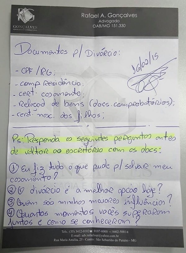 A imagem acima foi copiada do site Doce Verdade. O título da matéria é Advogado salva casamento arruinado, com apenas um bilhete!